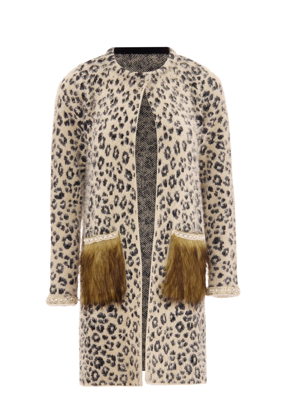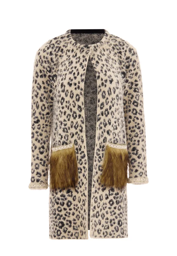Deze knielange jas is gemaakt voor de modebewuste persoon en heeft een opvallend patroon geïnspireerd op wilde katten. De ronde halslijn en open voorkant creëren een elegant silhouet, terwijl de opgestikte zakken met contrasterende structuuraccenten verfijning uitstralen.
