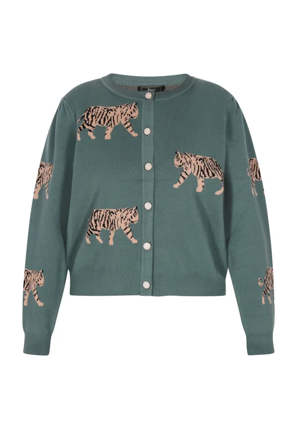 Laat je wilde kant de vrije loop met dit opvallende kledingstuk. De ronde halslijn en lange mouwen zorgen voor een klassiek silhouet, terwijl de verspreide tijgerpatronen een wild accent toevoegen. De knoopsluiting aan de voorkant heeft contrasterende knopen die voor extra visuele highlights zorgen. Geribbelde details aan de zoom, manchetten en halslijn zorgen voor een nauwsluitende pasvorm - ideaal om als laagje over je favoriete outfits te dragen. Vest
