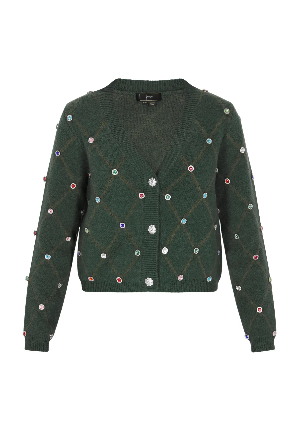 Maak kennis met een stijlvol gebreid vest met knopen en een geribde v-hals. Dit vest heeft lange mouwen, geribde manchetten en een patroonontwerp met ruitvormige details. Versierd met juwelen in een regelmatig patroon, biedt het een getailleerd silhouet. Vest