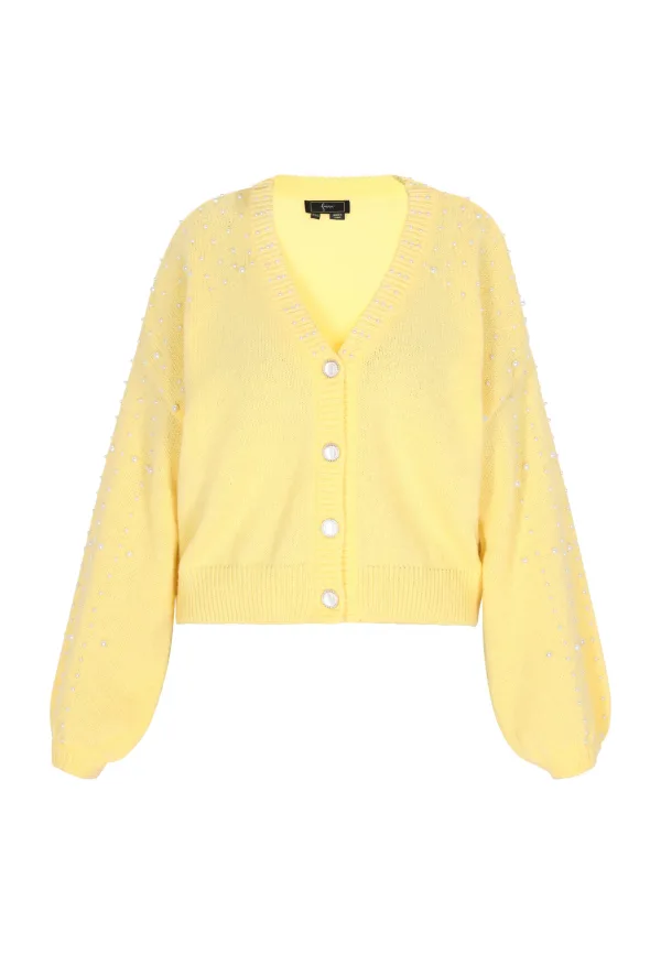 Laat je betoveren door de charme van dit vest met V-hals en knoopsluiting. De lange mouwen en relaxte pasvorm bieden moeiteloos comfort. De geribde zoom, manchetten en halslijn voegen structuur toe, terwijl kleine versieringen een vleugje elegantie toevoegen. Perfect voor een casual look of om over je favoriete outfits heen te dragen. Vest