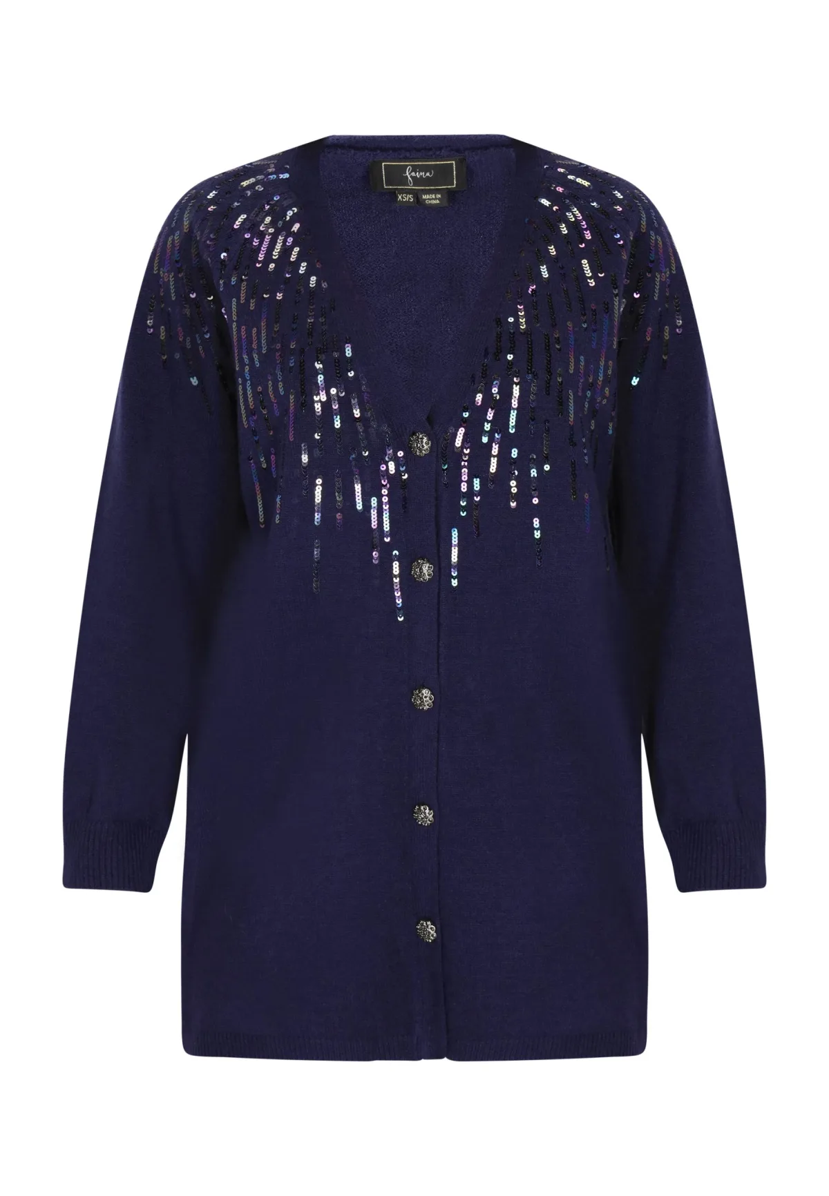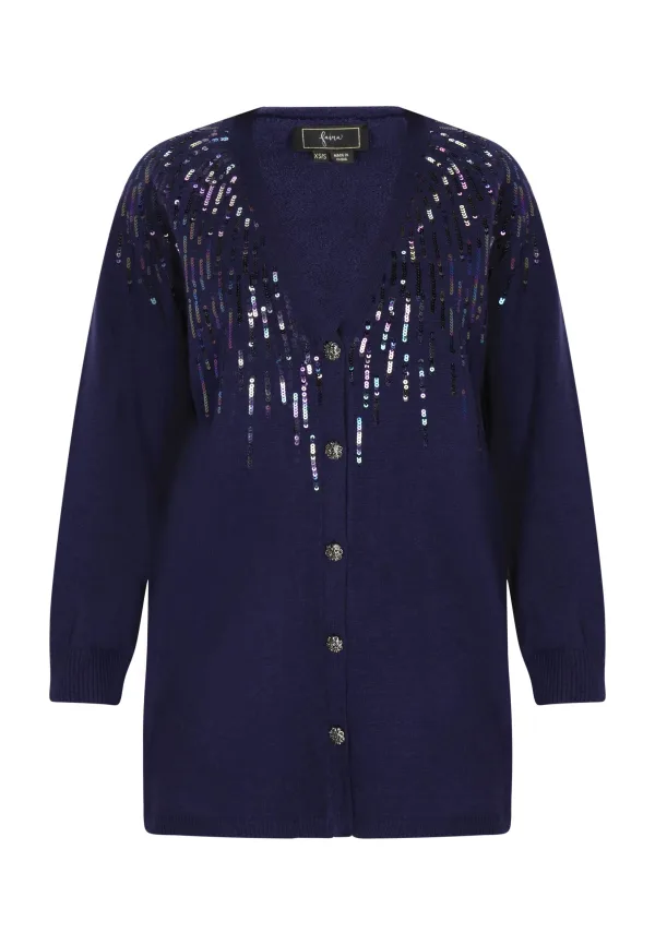 Transformeer je stijl met dit lange, elegante vest met V-hals dat charme uitstraalt. Versierd met sprankelende pailletten en stijlvolle knopen, geeft het elke outfit verfijning. De zachte gebreide stof zorgt voor comfort, terwijl de geribde manchetten en zoom de verfijnde uitstraling versterken. Deze warme trui met lange mouwen is de perfecte keuze voor een elegant evenement. Vest