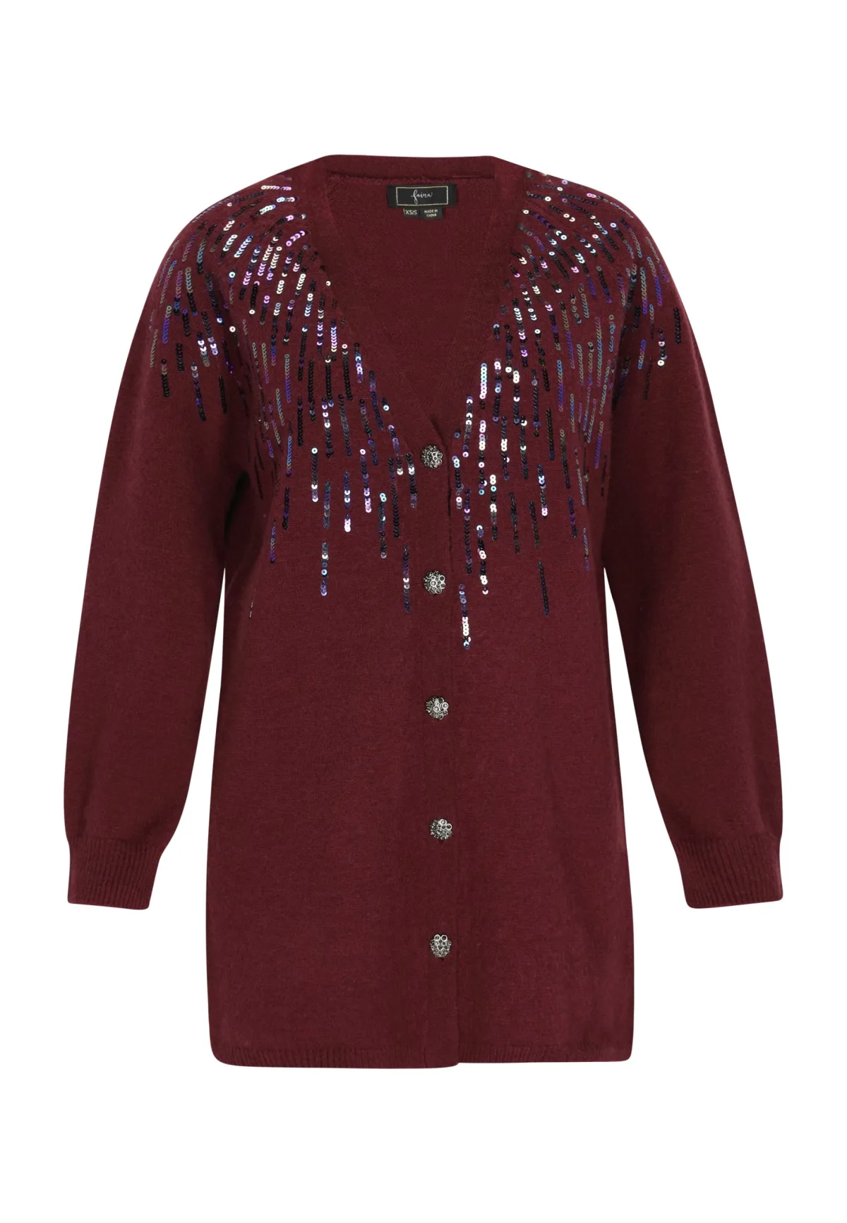 Transformeer je stijl met dit lange, elegante vest met V-hals dat charme uitstraalt. Versierd met sprankelende pailletten en stijlvolle knopen, geeft het elke outfit verfijning. De zachte gebreide stof zorgt voor comfort, terwijl de geribde manchetten en zoom de verfijnde uitstraling versterken. Deze warme trui met lange mouwen is de perfecte keuze voor een elegant evenement. Vest