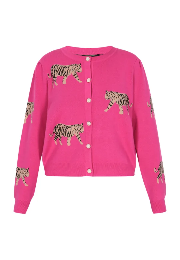 Laat je wilde kant de vrije loop met dit opvallende kledingstuk. De ronde halslijn en lange mouwen zorgen voor een klassiek silhouet, terwijl de verspreide tijgerpatronen een wild accent toevoegen. De knoopsluiting aan de voorkant heeft contrasterende knopen die voor extra visuele highlights zorgen. Geribbelde details aan de zoom, manchetten en halslijn zorgen voor een nauwsluitende pasvorm - ideaal om als laagje over je favoriete outfits te dragen. Vest