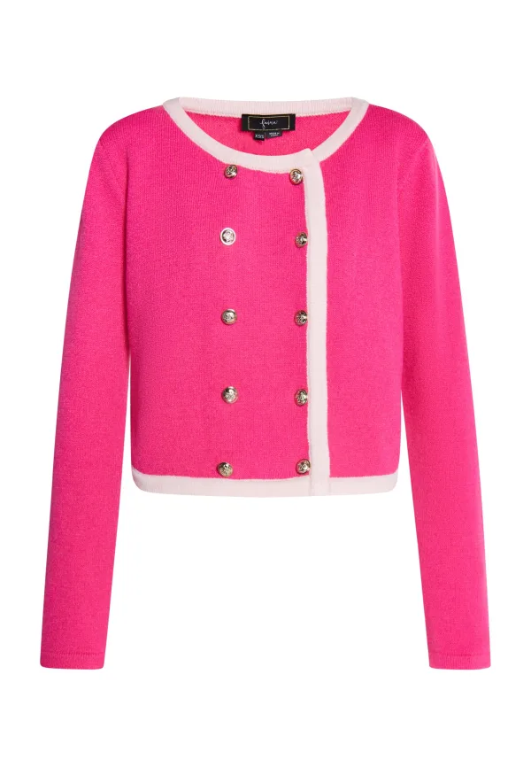 Dit vest van faina is elegant, klassiek en tijdloos. Het elegante it-stuk verbetert onmiddellijk elke look. Gemaakt van een zachte garenmix, de contrasterende ribgebreide manchetten en de goudkleurige knopen met reliëf geven het iets kortere jasje met afgeronde zoom een bijzonder Franse chic. Vest