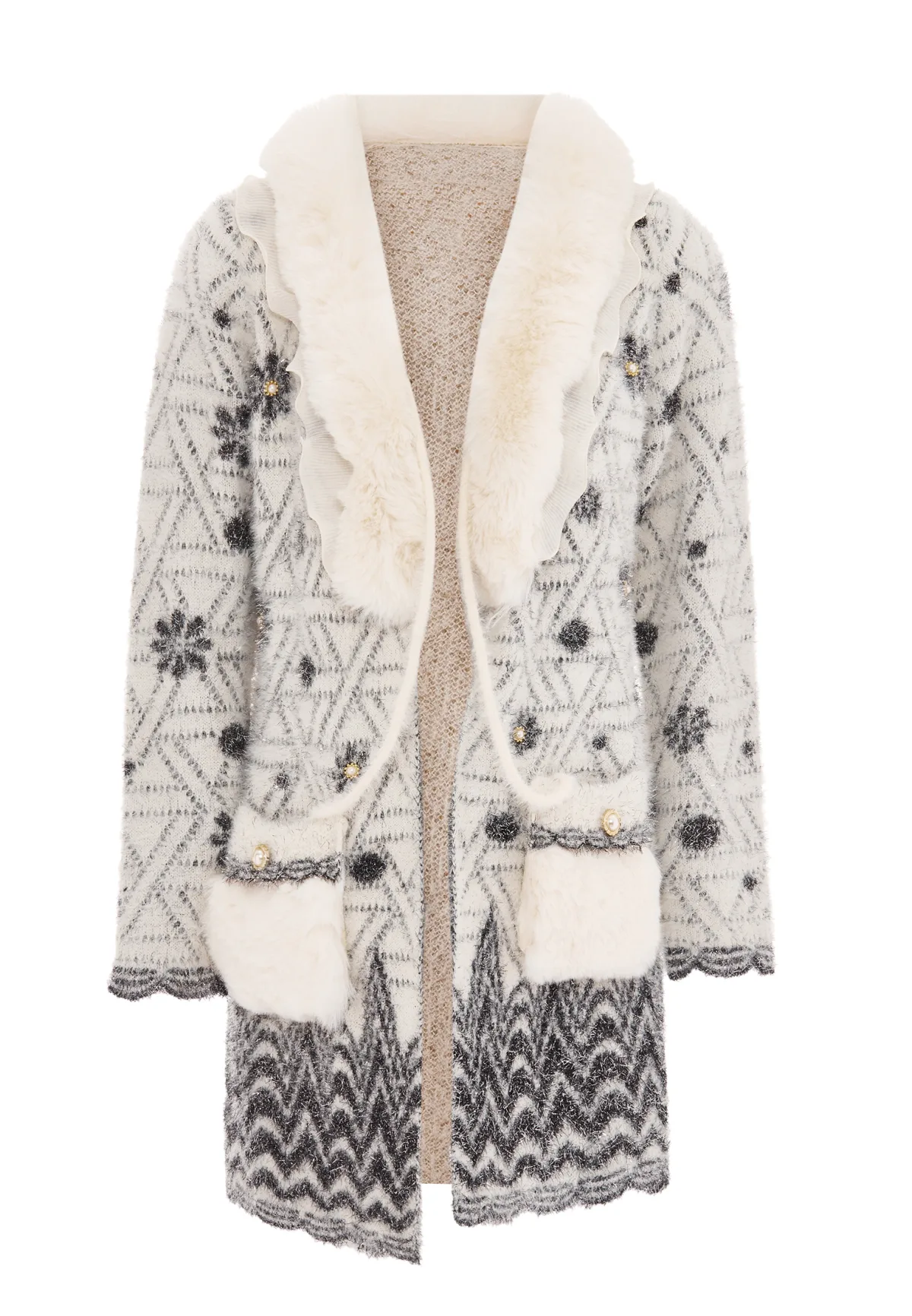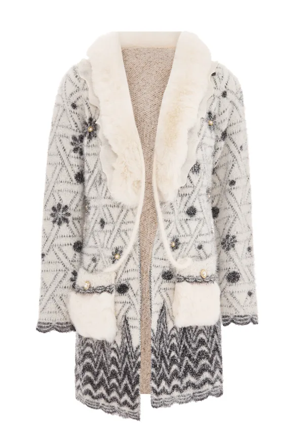 Upgrade je garderobe met dit ingewikkeld ontworpen vest met een betoverend geometrisch patroon en delicate versieringen die op bloemen of sterren lijken. De donzige kraag en manchetten zorgen voor een luxe uitstraling, terwijl de getextureerde bies langs de zoom, manchetten en voorkant voor een opvallend contrast zorgt. Het geheel wordt gecompleteerd door zichtbare knopen versierd met uitgebreide details.