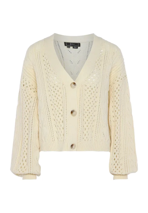 In dit model van Faina worden fijn gaatjesbreisel en klassiek kabelbreisel gecombineerd tot een elegant vest. De diepe V-hals, de prachtige knopen in hoornlook en de comfortabele geribde manchetten maken het design compleet. Jumper