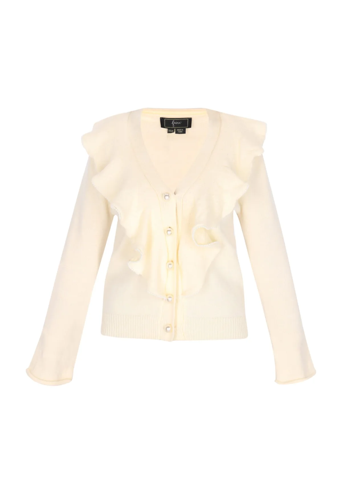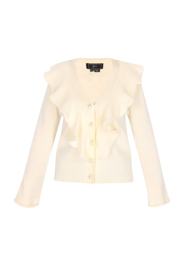 Ontdek een stijlvolle toevoeging aan je garderobe met dit elegante vest. De V-halslijn en ruches langs de voorkant en zoom geven het geheel een vrouwelijke touch. Contrasterende details benadrukken het golvende patroon van de ruches, terwijl geribde manchetten en een geribde zoom voor extra structuur zorgen. Het ontwerp wordt afgerond met een knoopsluiting - perfect om een vleugje charme aan je outfit toe te voegen. Vest