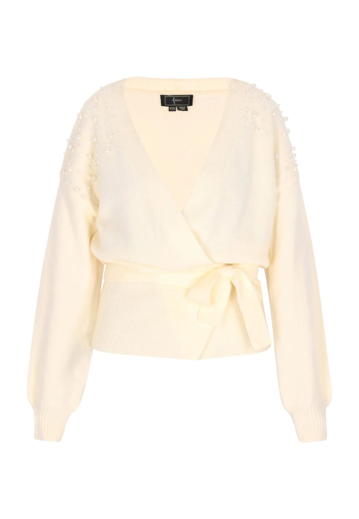 Deze gebreide trui heeft een verfijnd wikkelontwerp met een strikband aan de zijkant in de taille. Het straalt elegantie uit met een flatterende V-hals en lange mouwen. De decoratieve details op de schouders zorgen voor een vleugje glamour. De geribde manchetten en onderzoom zorgen voor een goede pasvorm, waardoor hij geschikt is voor zowel casual als semi-formele gelegenheden. Een comfortabele en toch stijlvolle toevoeging aan je garderobe. Vest