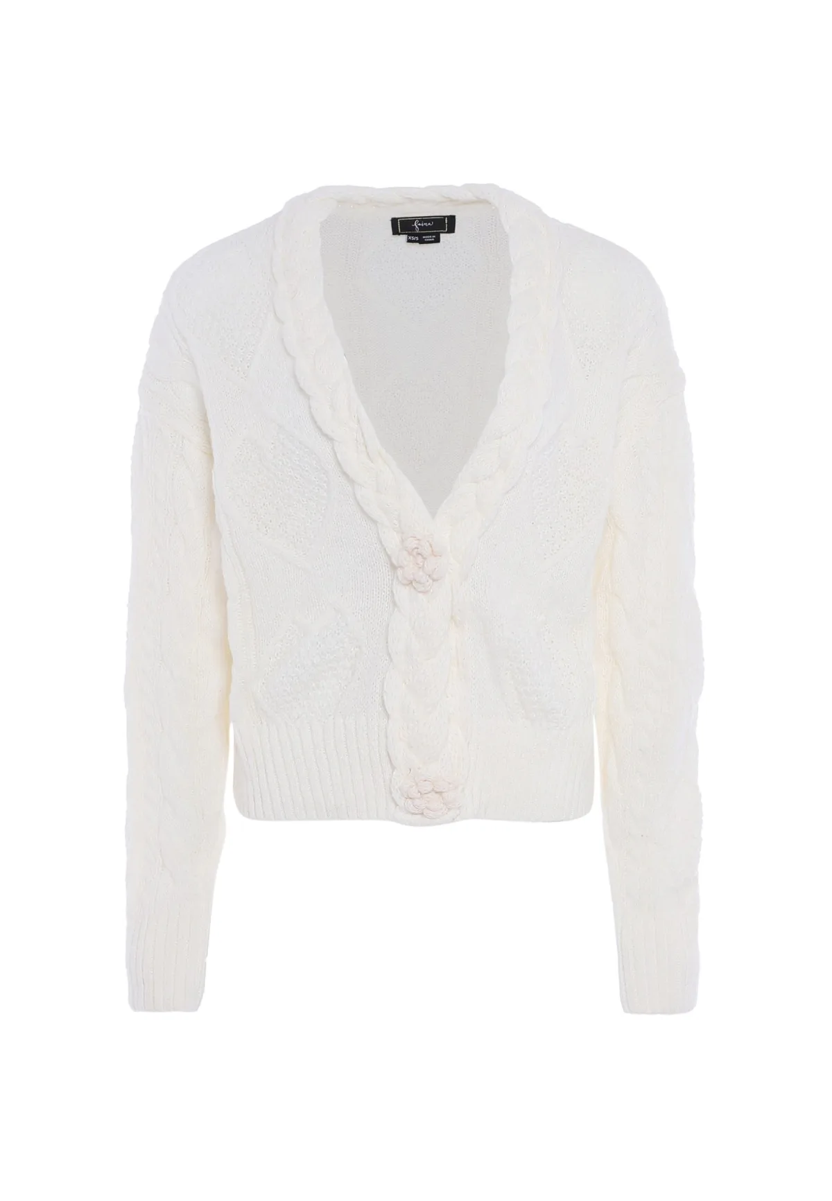 Het vest van Faina overtuigt door zijn gezellige breisel en elegante structuur. Het zachte garen voelt zacht aan met een gebreid patroon, een V-hals en een gevlochten kabel langs de halslijn. De gehaakte bloemknopen en de geribde manchetten maken het model compleet. Gebreid jasje