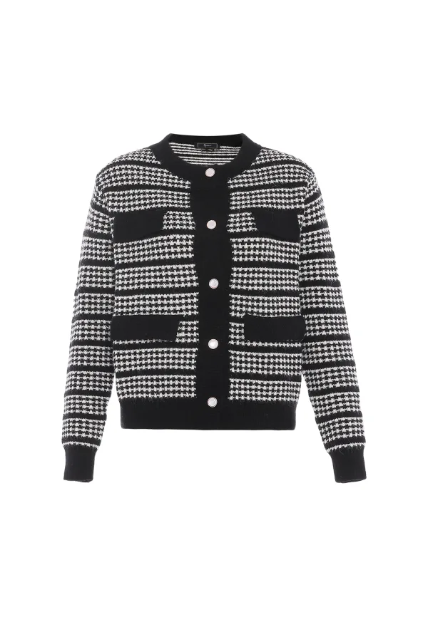Hier is een stijlvol gebreid vest met een fascinerend patroonontwerp. Dit kledingstuk heeft een klassieke ronde halslijn en een opening aan de voorkant die is vastgezet met knopen voor gemakkelijk aankleden. De lange mouwen hebben geribde manchetten, terwijl twee praktische opgestikte zakken het taillegedeelte versieren. Gebreid jasje