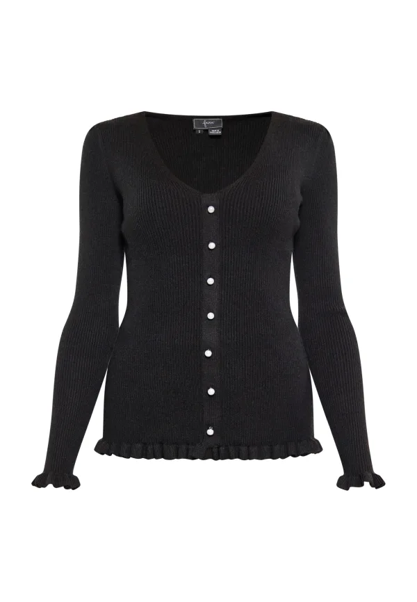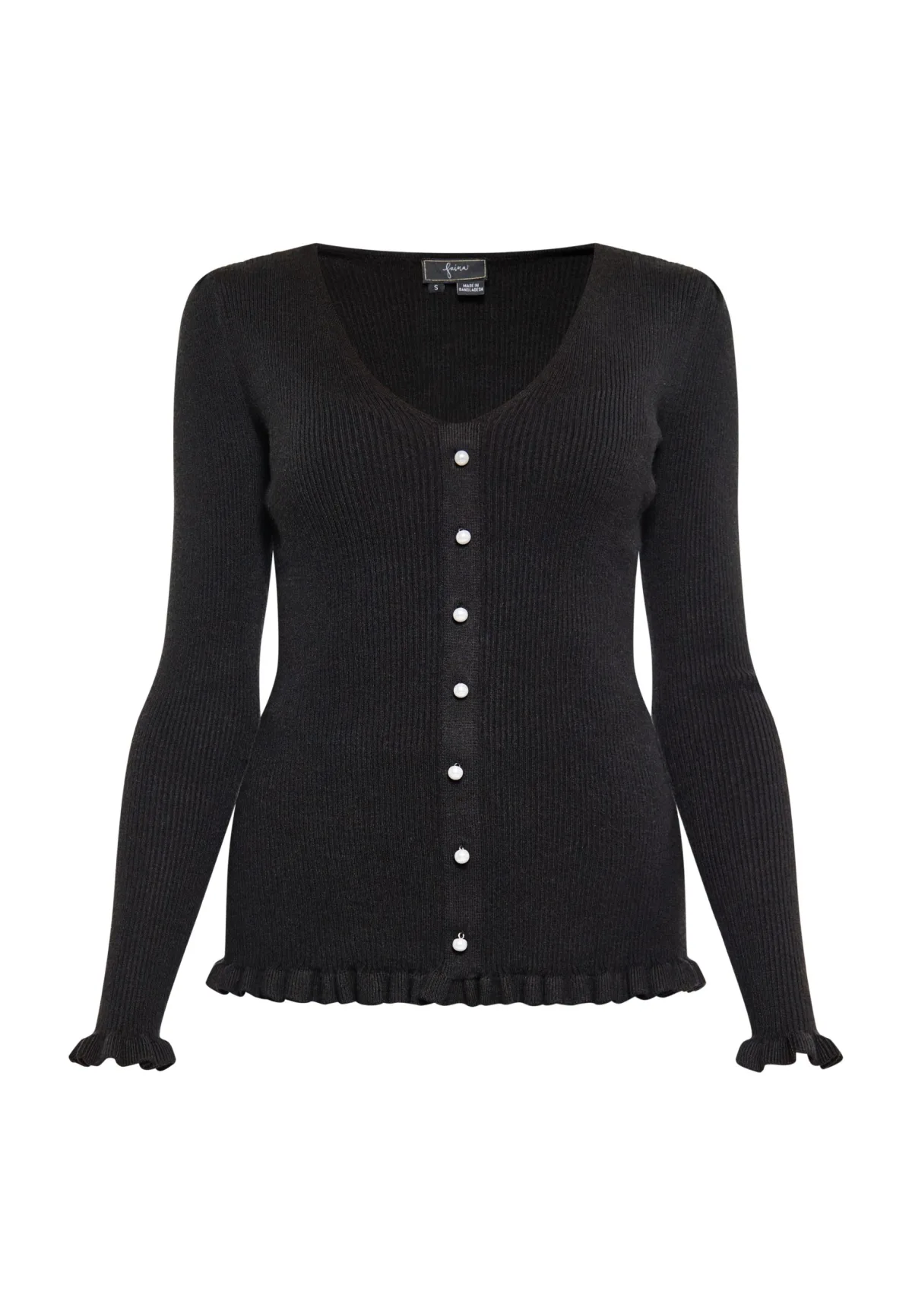Dit geribbelde vest is een verfijnde toevoeging aan je garderobe. De V-hals en knoopsluiting aan de voorkant stralen elegantie uit, terwijl de ruches aan de manchetten en zoom een vleugje vrouwelijkheid toevoegen. Dit vest met lange mouwen is gemaakt van gebreide stof voor warmte en comfort en heeft een aansluitend silhouet dat je figuur moeiteloos flatteert. Omarm de casual maar toch verfijnde stijl met ruches en ribbels die elke outfit naar een hoger niveau tillen. Vest