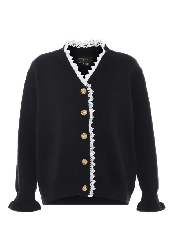 Geniet van de exquise charme van dit gebreide vest met V-hals en kanten rand aan de kraag. De opening aan de voorkant is versierd met delicate kanten randen en sierlijke ronde knopen, waardoor een perfecte mix van klassieke en vrouwelijke esthetiek ontstaat. Met lange mouwen, geribde manchetten en een geribde zoom voegt dit vest tijdloze elegantie toe aan je garderobe. Vest trui
