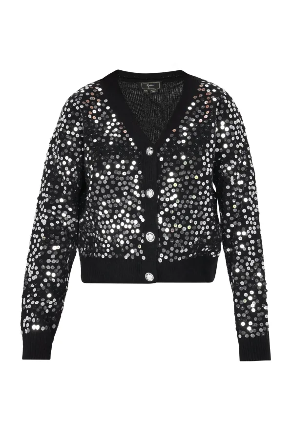 Geef je stijl een boost met dit prachtige vest met V-hals, versierd met glanzende pailletten die het licht prachtig opvangen. De lange mouwen zijn ontworpen met geribde manchetten voor een gezellige pasvorm, terwijl de knoopsluiting aan de voorkant de verfijnde uitstraling versterkt. Dit chique exemplaar is perfect om een vleugje glamour aan elk ensemble toe te voegen, waardoor het een must-have toevoeging is. Vest