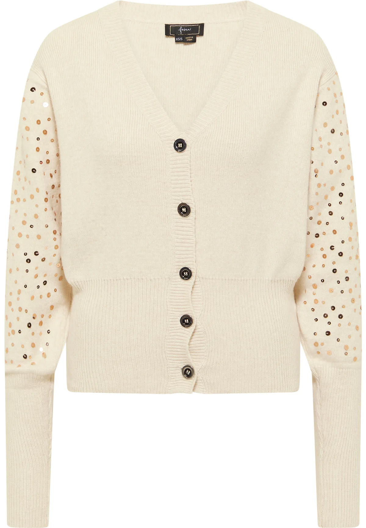 Voor speciale gelegenheden of gewoon een beetje glamour in het dagelijks leven - dit vest van faina begeleidt u altijd in stijl. De nauwsluitende vorm met een diepe V-hals en extra brede manchetten omhelst elegant, terwijl de lange, comfortabele fijnribbige manchetten de paillettenmouwen vakkundig in de kijker zetten. Dit onderstreept ook de glans van de sluitknopen en verrijkt uw garderobe met een spannend, elegant kledingstuk. Maak het af met slanke broeken en langere rokken die op de lijn zijn gesneden.