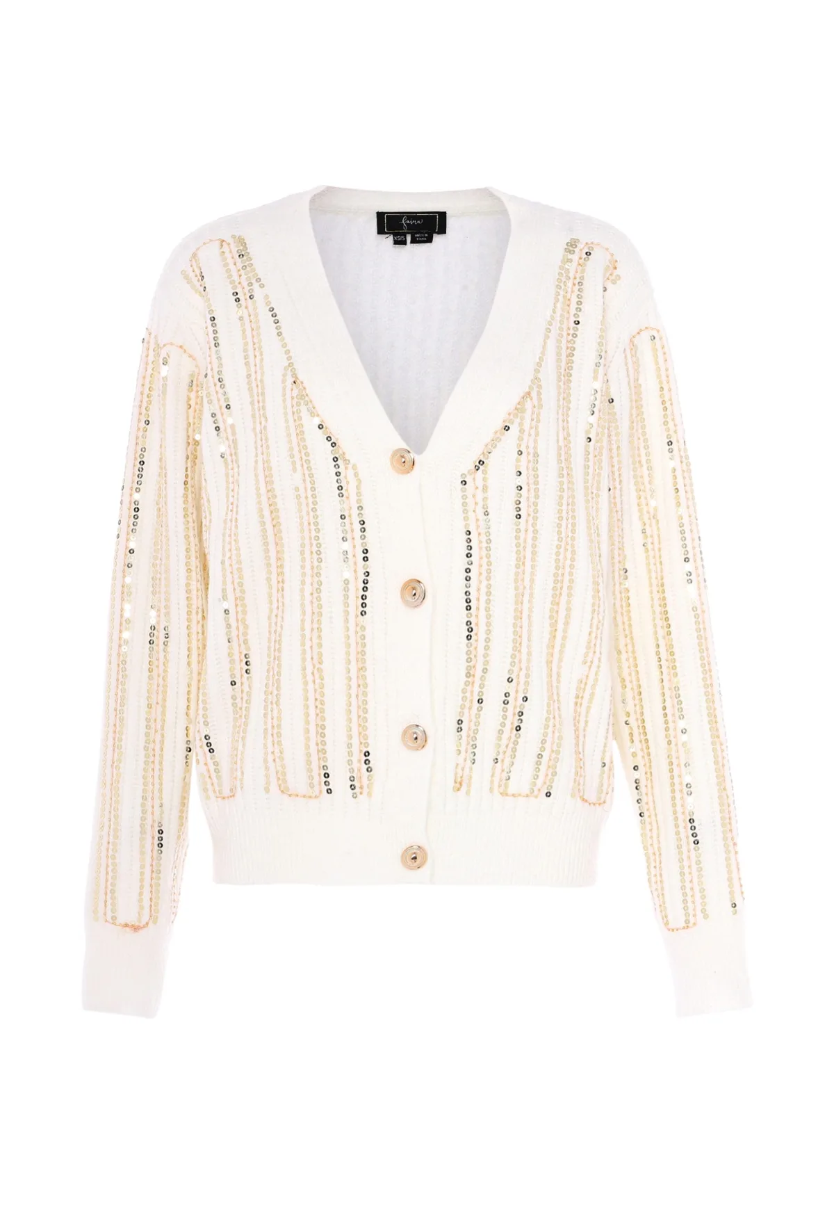Dit faina vest voegt een dosis glamour toe aan je garderobe. De zachte garenmix met V-hals is geborduurd met pailletten en baleinen waardoor je er 's avonds oogverblindend uitziet. Gebreid jasje