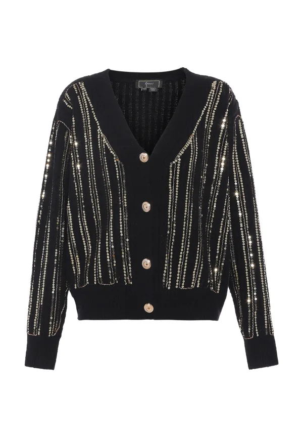 Dit faina vest voegt een dosis glamour toe aan je garderobe. De zachte garenmix met V-hals is geborduurd met pailletten en baleinen waardoor je er 's avonds oogverblindend uitziet. Gebreid jasje
