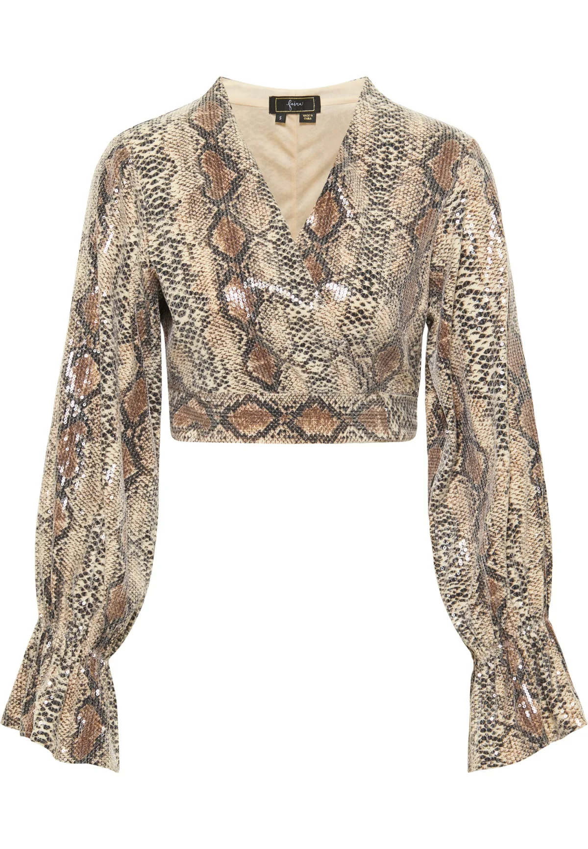 Feest des te mooier met de juiste hoeveelheid glamour. Met deze wikkelblouse van faina, die eenvoudig over het zwarte jurkje wordt geknoopt, krijgt u stralende sterallures. Glinsterende pailletten zijn geborduurd op een rekbaar materiaal en afgewerkt met een exotische slangenprint. De wijde mouwen krijgen een ruched look door de elastische manchetten, waardoor ze perfect passen bij de diepe V-halslijn. De tailleband heeft lange, materiaalachtige banden die zich om de taille wikkelen.