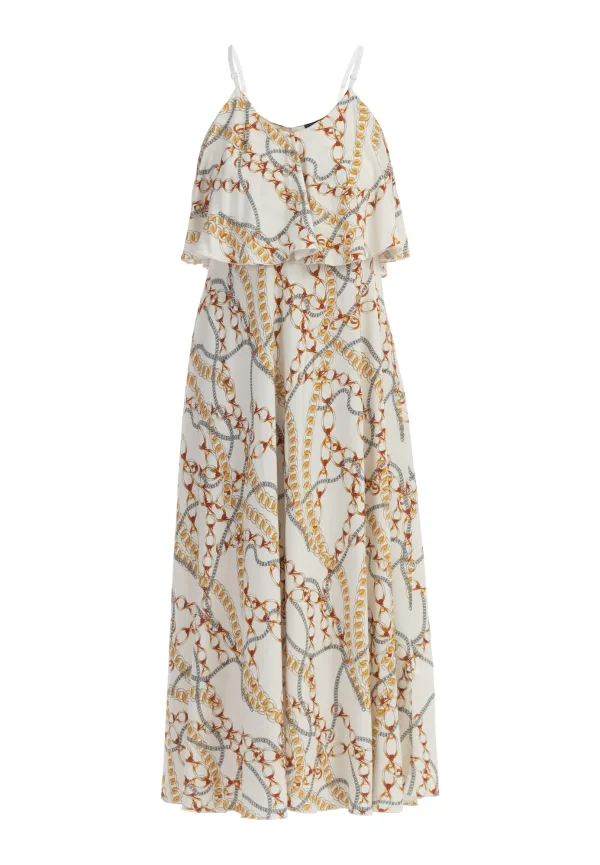 Voor een virtuoze zomerlook kiezen we voor de maxi-jurk van faina. Het lange model met verfijnde gouden kettingprint overtuigt door zijn elegante gelaagde look, die in Italië is gemaakt van zacht viscosemateriaal. Hierdoor heeft de jurk een zwierige herfst die perfect is om te schitteren op het volgende tuinfeest. Door van sandalen naar hoge hakken te wisselen, verandert deze elegante zomerjurk in een vrouwelijke avondjurk. Spaghettijurk maxi