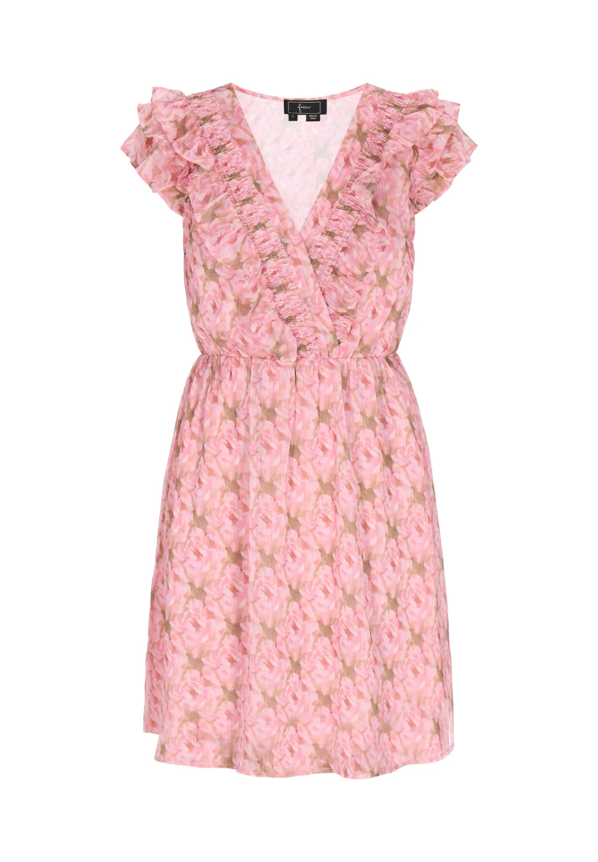 Design: Gevoerde zoom/rand, Met onderjurk, Tailleband, Diepe snit/decolleté; Materiaal: Chiffon; Halstype: V-hals; Motief: Bloemenprint; Details: Ruches, Gedrapeerd; Extra's: All-over patroon, Fijne stof; Lengte: Kort/mini; Snit: Getailleerd; Pasvorm: Normale pasvorm; Armlengte: Kwartmouw