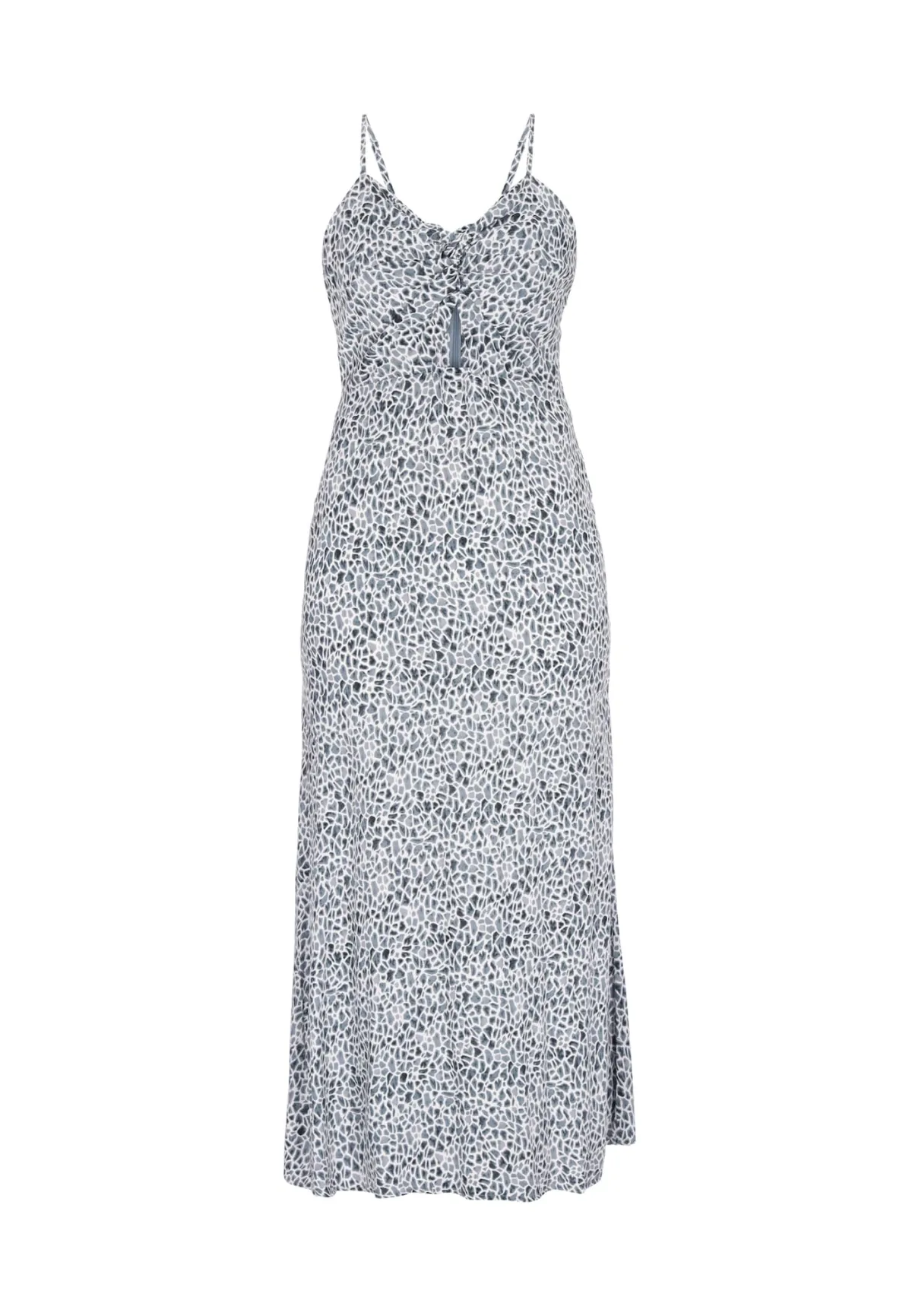 Design: Split; Type sluiting: Ritssluiting; Materiaal: Viscose; Halstype: V-hals; Soort bandjes: Spaghettibandjes; Details: Gedrapeerd; Extra's: All-over patroon; Lengte: 3/4 lengte; Snit: Getailleerd; Pasvorm: Slanke pasvorm; Armlengte: Mouwloos