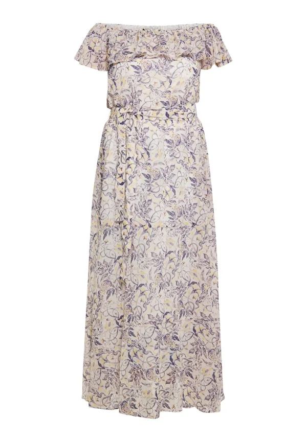 Geef je stijl een boost met deze off-shoulder maxi-jurk. Het bloemmotief en de ruches-overlay stralen romantiek uit. Het elastische lijfje zorgt voor een goede pasvorm, terwijl de bijpassende riem de taille accentueert voor definitie. Deze vloeiende A-lijnjurk met korte mouwen biedt zowel elegantie als comfort voor elke gelegenheid. Jurk