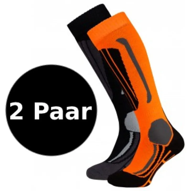 Falcon Victor skisokken Set van twee paar skisokken van hoogwaardige kwaliteit met hoog draagcomfort en ergonomische pasvorm. Deze ski sokken bieden verlichting op de juiste punten waar veel druk op komt. Kleuren: zwart en oranje. Ski/snowboard sokken van het merk Falcon.