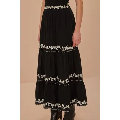 FARM Rio Black Embroidered Ruffled Maxi Skirt