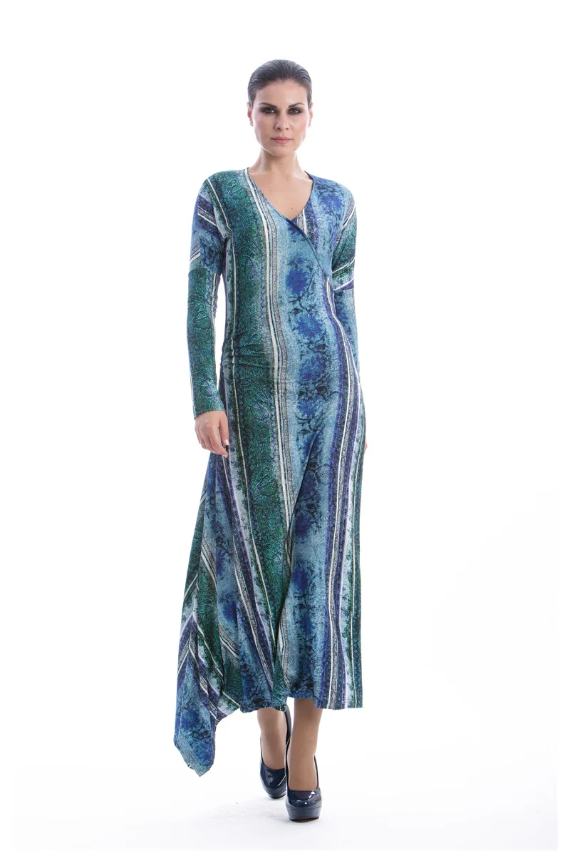 Jurk CONQUISTA van viscose-elastanprintstof. Lange mouwen en faux wikkelsilhouet met een opening bij de linkerschouder. Aansluitend op de taille en A-lijn silhouet vanaf de taille naar beneden. Asymmetrische zoom die slechts aan één kant een punt creëert. Maxilengte. Het model is 1.77m en draagt maat 36/S. 92% viscose-8% elastan