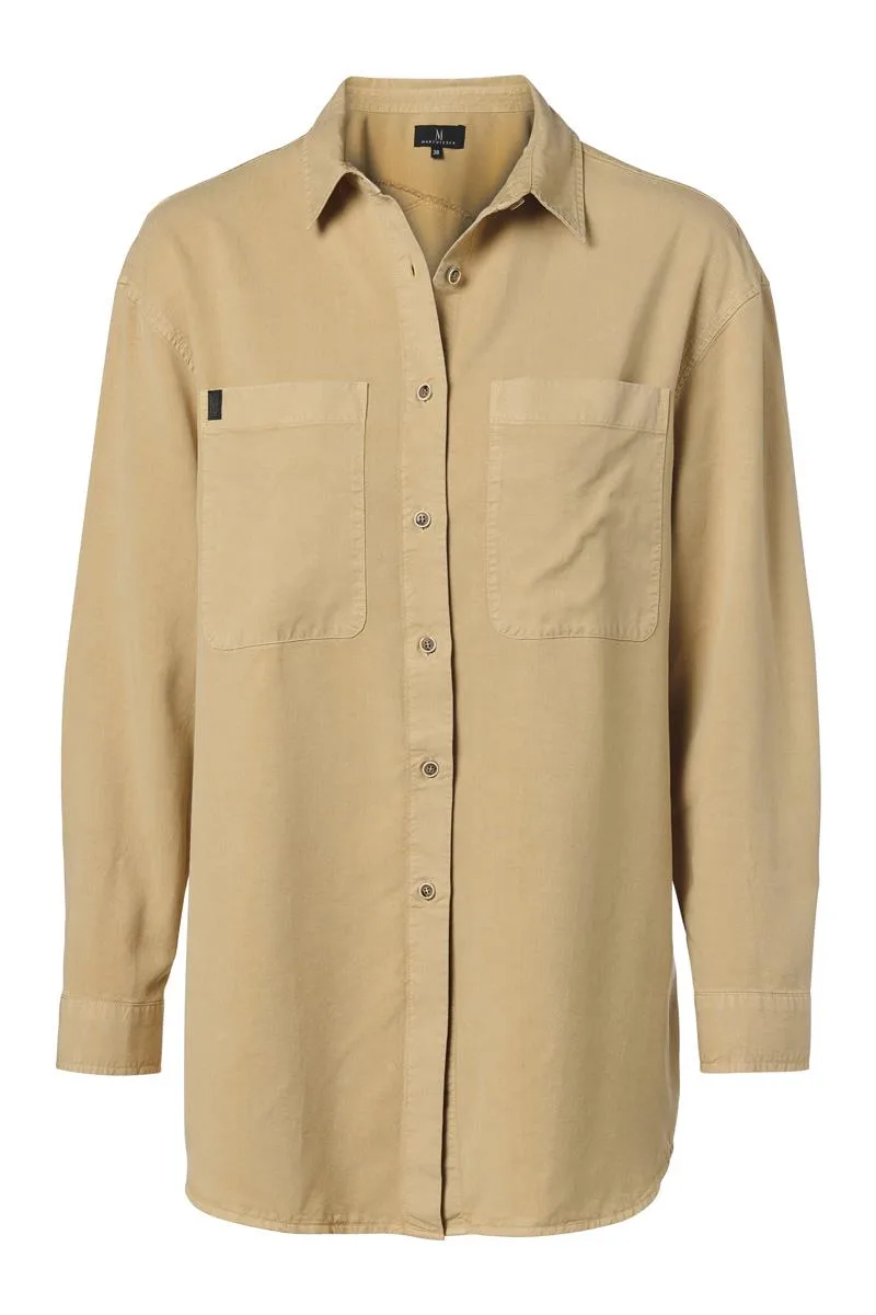 Deze licht en luchtige zomerblouse van Mart Visser biedt echt hoogwaardige kwaliteit. Vervaardigd uit 100% duurzaam Tencel, ook bekend als Lyocell, biedt deze blouse optimaal comfort. Met zijn omgeslagen kraag en lange mouwen met klassieke manchetten straalt het een tijdloze elegantie uit. Het voorpand is voorzien van twee borstzakken, elk met een opvallende MV-patch, en sluit met bronzen knopen die een stoere touch toevoegen. De rechte pasvorm zorgt voor een comfortabele en flatterende look, met een rechte zoom aan de voorkant en een iets langere achterkant die het figuur mooi accentueert. De verlaagde schouders geven een nonchalante uitstraling, terwijl de diagonale naden op de rug een smaakvol en eigentijds design creëren. De subtiel doorgestikte naden en afwerkingen dragen bij aan het stoere karakter van deze blouse, waardoor het een uniek en stijlvol item is voor elke gelegenheid.