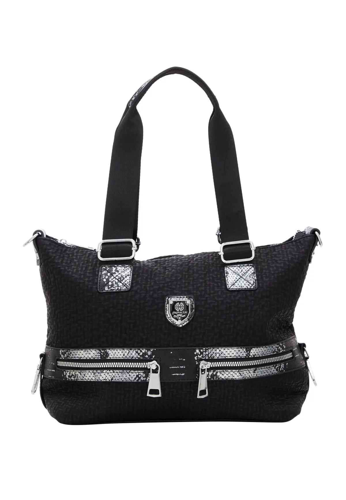 Maak kennis met onze gestructureerde draagtas, met een opvallend embleem op de voorkant. De twee draaggrepen zijn verstelbaar dankzij de metalen fittingen. Deze tas heeft ook vakken met ritssluiting aan de buitenkant en een unieke rand met patroon. Symmetrisch gedessineerde patches en kleine metalen details dragen bij aan de esthetische aantrekkingskracht. Met een ruim interieur en meerdere compartimenten voor organisatie, is deze tas perfect voor elke gelegenheid.