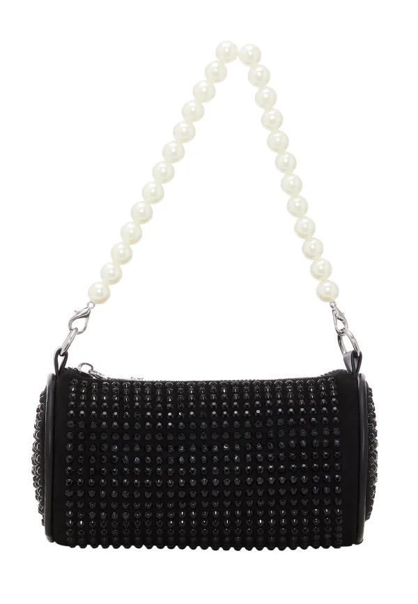 Maak kennis met onze prachtige rechthoekige tas, versierd met een prachtige reeks ronde, juweelachtige decoraties, gerangschikt in strakke, gelijkmatige rijen. Het glanzende patroon dat door deze decoraties ontstaat, zal zeker de aandacht trekken. Met een gestructureerde, platte bodem en een bovenrand met ritssluiting voor gemakkelijke toegang tot het hoofdcompartiment, is deze tas zowel stijlvol als functioneel. Een riem gemaakt van onderling verbonden bolvormige kralen creëert een elegant accent dat doet denken aan sieraden. Perfect voor formele gelegenheden of avondgelegenheden