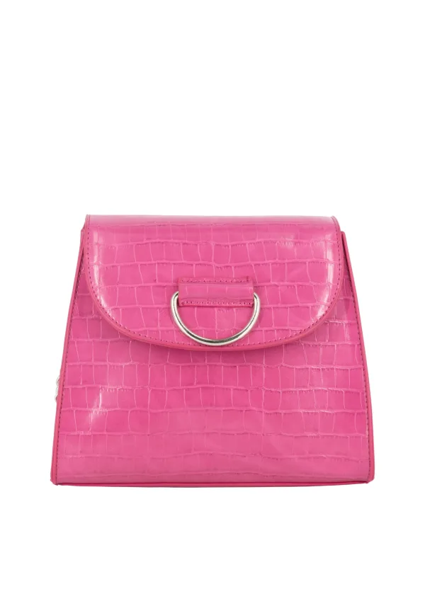 Deze elegante handtas van FELIPA heeft een minimalistisch ontwerp. De licht conische vorm is verfijnd met een reliëf van krokodillenleer, terwijl een zilverkleurig designelement op de klep de aandacht trekt. De tas kan comfortabel om de schouder worden gedragen met de lange schakelketting en het schouderstuk van hetzelfde materiaal. Het ruime interieur met een zijvak met rits wordt goed afgesloten door een magenta sluiting op de klep.
