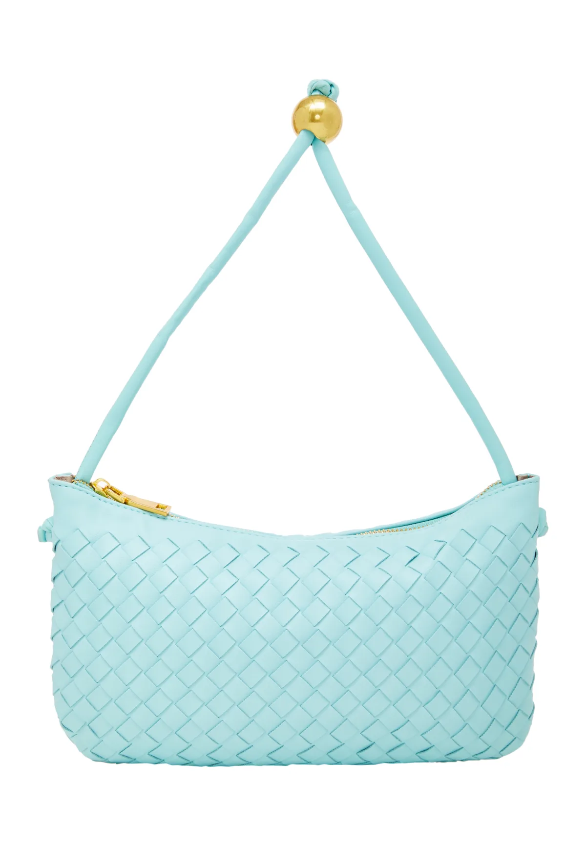 Deze handtas heeft een opvallende geweven textuur aan de buitenkant en heeft een halfcilindrische vorm met een platte basis voor gemakkelijke plaatsing. Het wordt vastgezet met een ritssluiting en heeft een dun bandje versierd met kleine knopen en een decoratieve bolvormige kraal. Deze tas is ideaal voor dagelijks gebruik en straalt casual elegantie en stijl uit.