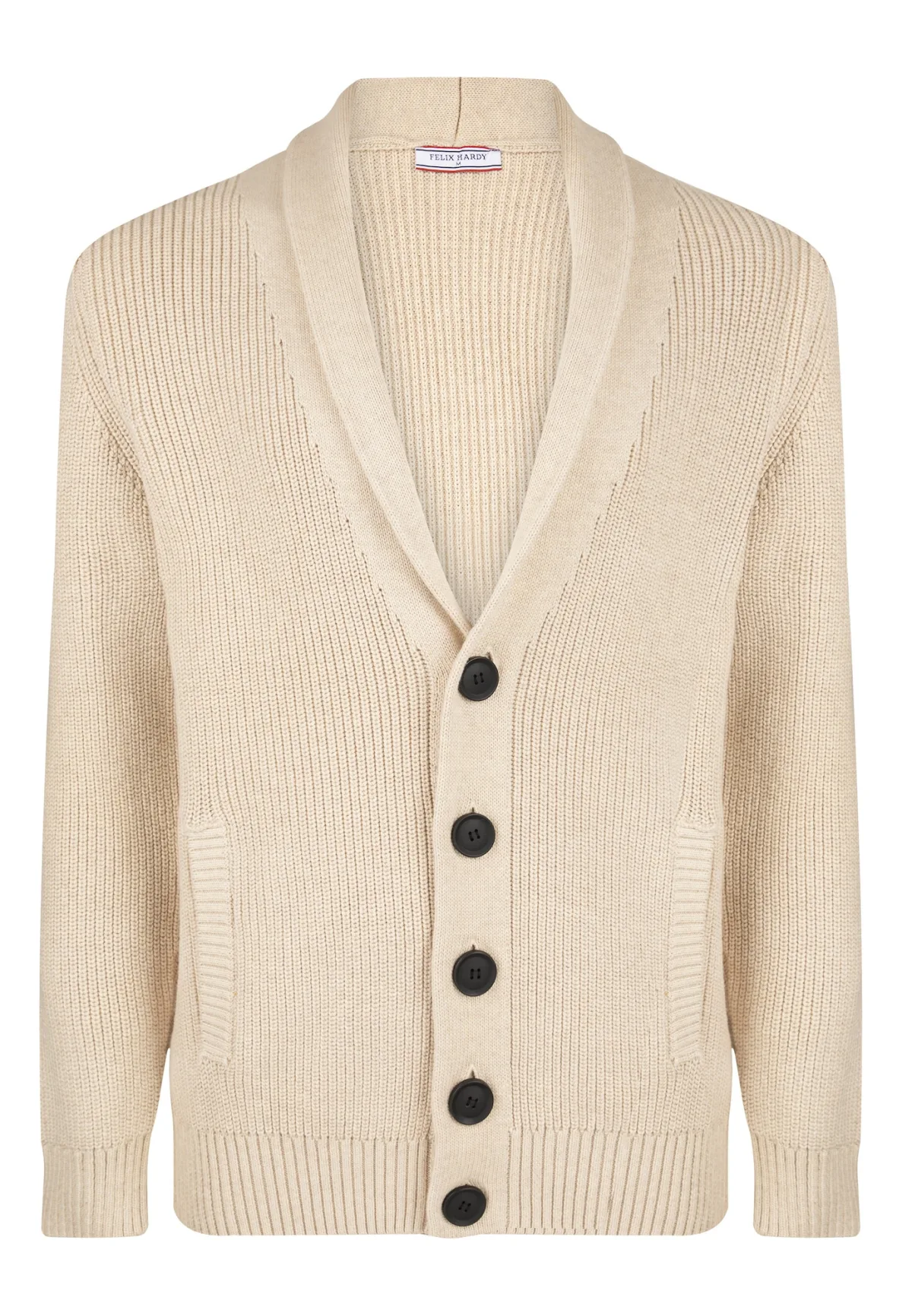 Design: Geribbelde kraag, Knop placket, Geribd ceintuurtje, Zakken aan de zijkant; Type sluiting: Knoopsluiting; Materiaal: Knitwear; Halstype: Sjaalkraag; Motief: Effen; Extra's: Fully fashioned, Met textuur; Pasvorm: Normale pasvorm; Armlengte: Lange mouw; Lengte: Normale lengte