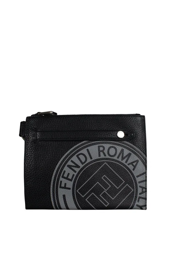 Fendi clutch van zwart generfd kalfsleer.Grijs logo-juk gedrukt op de voorkant.Leren handvat met metalen knoop.Verstelbare stoffen schouderband.Ritssluiting met zilveren trekje.Lokale met logo aan de binnenkant.Binnenzak met ritssluiting.Afmetingen: 19 cm x 23,5 cm.Gemaakt in Italië.