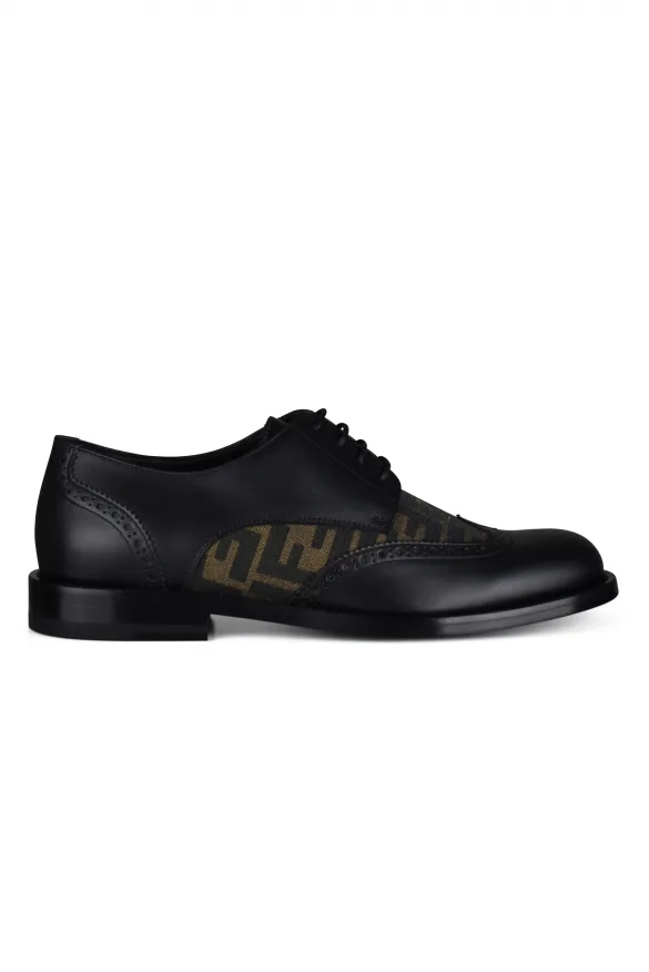 Zwart leren derby's van Fendi.Brogue-stiksels.FF-stofdetails in zwarte en tabaktinten. Zwarte vetersluiting aan de voorkant.Leren zool met antislip-injectie.Amandelvormige neus.Gemaakt in Italië.