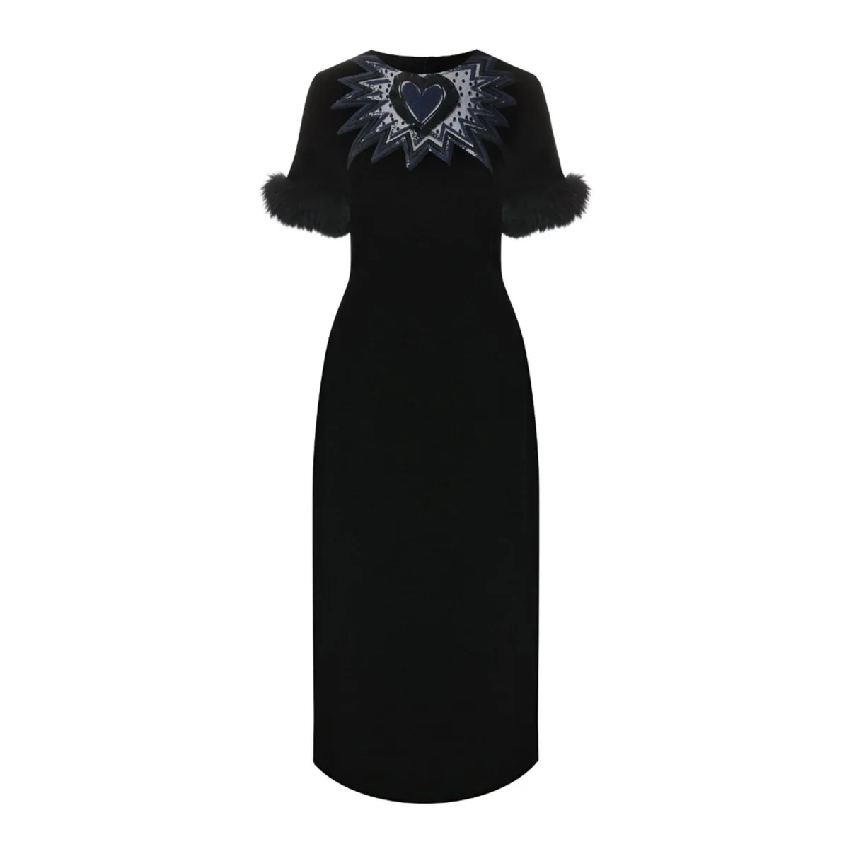 - Samenstelling: 92% Viscose 18% Zijde - Afwerking van vossenbont - Korte mouwen - Pailletten detail - Verborgen ritssluiting aan de achterkant - Volledig gevoerd - Normale pasvorm - Model is 1,78 m lang en draagt maat 42 - Gemaakt in Italië -