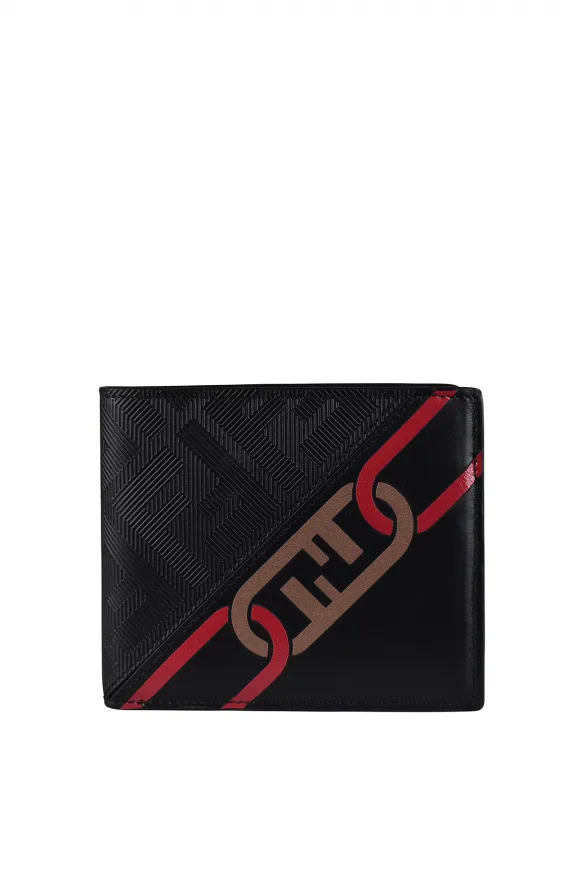 Fendi portemonnee van zwart leer.Zwart FF-reliëfpatroon.Rode Fendi-kettingprint. Bruine en zwarte kaartsleuven.Gemaakt in Italië.