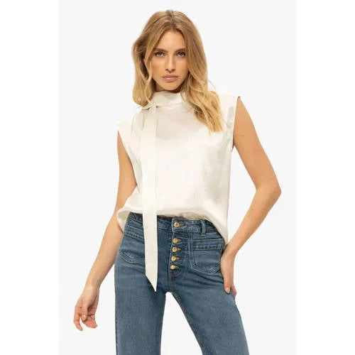 Deze mouwloze top met strikkraag van Fifth House is een elegante basic voor jouw garderobe. De ecru kleur geeft een rustige, frisse uitstraling en laat zich makkelijk combineren met zowel lichte als donkere tinten. De subtiele glans van de stof zorgt voor een verfijnde look, zonder dat het te opvallend wordt. Ideaal voor naar je werk, een etentje of een speciale gelegenheid.Verfijnde details voor elke dag Strikkraag voor een vrouwelijke, aangeklede uitstraling Mouwloos model, perfect voor het voorjaar en de zomer Rechtvallende pasvorm die soepel langs het lichaam valt Effen ecru kleur, makkelijk te combineren met blazers, rokken en broeken Voorzijde met knoopsluiting voor een nette, verzorgde look Glimmende finish van de stof voor een licht chique effect Geen zakken, waardoor de top mooi glad valt onder een blazer of vest Onderdeel van de Boutique collectie, met aandacht voor stijlvolle detailsVeelzijdig te combinerenDeze top draag je eenvoudig op een nette pantalon voor een zakelijke outfit, of juist op een jeans voor een meer ontspannen look. Onder een blazer komt de strikkraag mooi naar voren, terwijl je hem op warme dagen ook prima solo kunt dragen.Stijl van Fifth HouseFifth House ontwerpt mode met een moderne, vrouwelijke uitstraling. De collecties combineren slimme details met draagbare ontwerpen, zodat je er verzorgd uitziet op drukke werkdagen en speciale momenten. Met deze top kies je voor een stijlvol item dat seizoen na seizoen van pas komt.Een subtiel glanzende basis waarmee je in weinig tijd een verzorgde look neerzet.