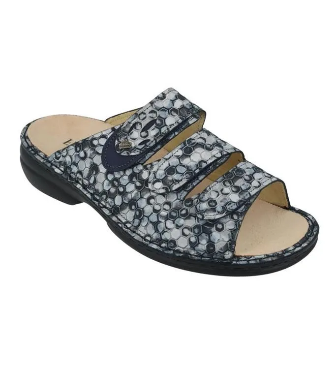 Gemini zeiDeze Finn Comfort Kos is een stijlvolle en comfortabele damesslipper die een uniek design combineert met de befaamde ergonomische ondersteuning van het Duitse kwaliteitsmerk. Dit specifieke model valt op door zijn moderne print en verfijnde afwerking.Hieronder vindt u een gedetailleerde omschrijving: Ontwerp & MateriaalBijzondere Print: De slipper is uitgevoerd in een opvallend geometrisch honingraatmotief in grijstinten, wat zorgt voor een eigentijdse en modieuze uitstraling.Drie Verstelbare Banden: Het model beschikt over drie individueel verstelbare klittenbandsluitingen over de wreef en voorvoet. Dit garandeert een optimale pasvorm, ongeacht de hoogte van uw wreef.Luxe Details: De bovenste band is verfraaid met een subtiel blauw accent en het kenmerkende metalen Finn Comfort-logo.Comfort & GezondheidAnatomisch Voetbed: De Kos is voorzien van een zacht, ergonomisch gevormd voetbed dat de voetboog ondersteunt en de natuurlijke houding bevordert.Verwisselbaar Voetbed: Zoals gebruikelijk bij Finn Comfort is het voetbed uitneembaar, waardoor de slipper uitermate geschikt is voor het gebruik van uw eigen orthopedische steunzolen.Hoogwaardige Voering: De binnenzijde is volledig met leer gevoerd, wat zorgt voor een zacht gevoel aan de voet en een uitstekend ademend vermogen.Zool & GripStabiele Loopzool: De zwarte, lichtgewicht kunststof zool biedt uitstekende demping en stabiliteit.Veilige Afwikkeling: De zool is ontworpen om schokken op te vangen en een soepele afwikkeling van de voet te ondersteunen, wat de gewrichten ontlast. Samenvattend: De Finn Comfort Kos is de ideale slipper voor de modebewuste vrouw die op zoek is naar maximaal comfort en een schoen die perfect passend te maken is voor elke voet.
