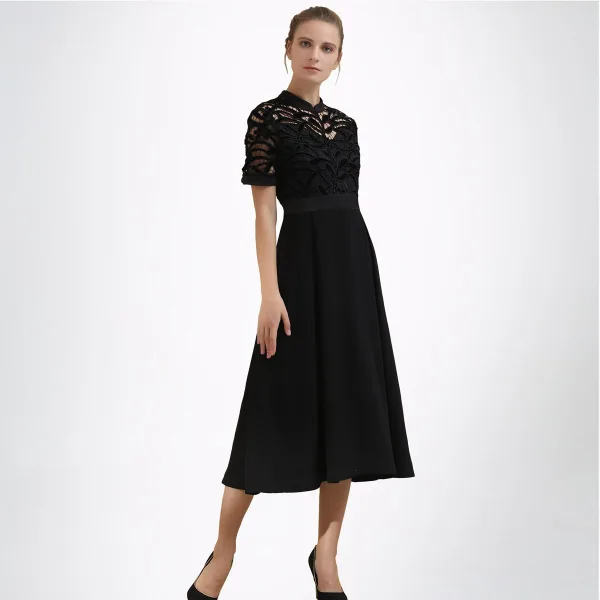 Gestructureerd met een gepast lijfje en een royaal wijd uitlopende rok, biedt deze jurk een flatterend en vrouwelijk silhouet. Het bovenste gedeelte heeft een verfijnd fluwelen bloemkant, de taille en manchetten zijn gemaakt van satijn.skirt in crêpe stof met royaal wijd uitgelegd volume. Een verfijnde versie van de kleine zwarte jurk: een must in je avondgarderobe. Productdetails: Vorm: fit-and-flare Lengte: 124 cm; onder de knie Korte mouwen Hoge kraag dichtgeknoopt in het midden van de achterkant