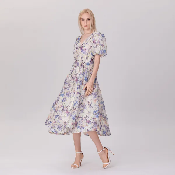 Een romantisch en delicaat exemplaar met een veelkleurig bloemmotief van organza. Het accentueert op elegante wijze het silhouet met de korte pofmouwen, de V-hals en het dunne riempje dat de taille verhoogt. De jurk is volledig gestructureerd met een verticale bias die de lijn subtiel energie geeft. Een verfijnd en ademend kledingstuk, ideaal voor het zomerseizoen. Het is geschikt voor semi-formele lente-zomergelegenheden zoals bruiloften, recepties of tuinfeesten. Productdetails: De volledige lengte bedraagt 127 cm. Het model draagt maat 10 en haar lengte is 5"7. Vorm: fit en flare V-hals Korte mouwen Onzichtbare ritssluiting middenachter