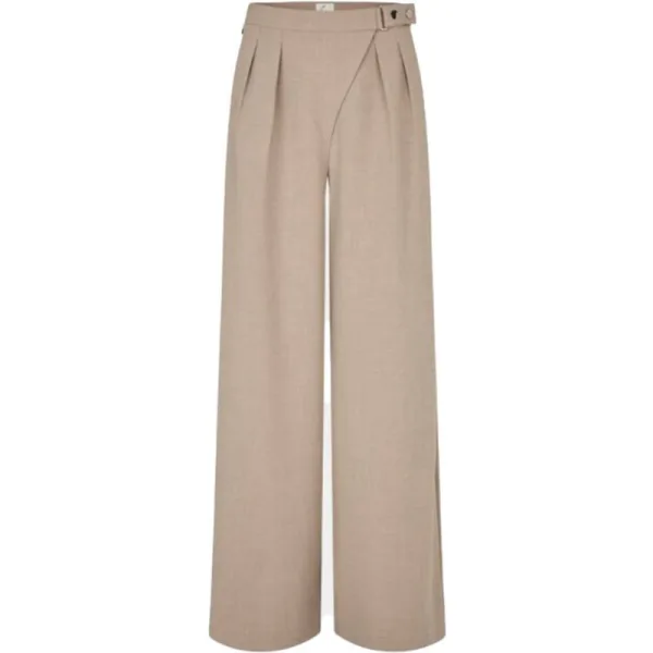 De wide-leg en high-waisted UmaFV-broek heeft een subtiel uitlopende pasvorm voor een elegante maar toch ontspannen uitstraling. De broek is ontworpen met een asymmetrische sluiting aan de voorkant, vastgezet met een gesp, drukknopen en een ritssluiting voor een verzorgde afwerking. Voorzien van functionele steekzakken in de zijnaad en achterzakken met klep. Plooien aan de voorkant geven extra structuur en definiëren het silhouet. Ontworpen in Kopenhagen. Extra wijde pasvorm Hoge taille Kleur: Latte melange Materiaal: 65% Recycled Polyester, 28% Viscose, 7% Elastane