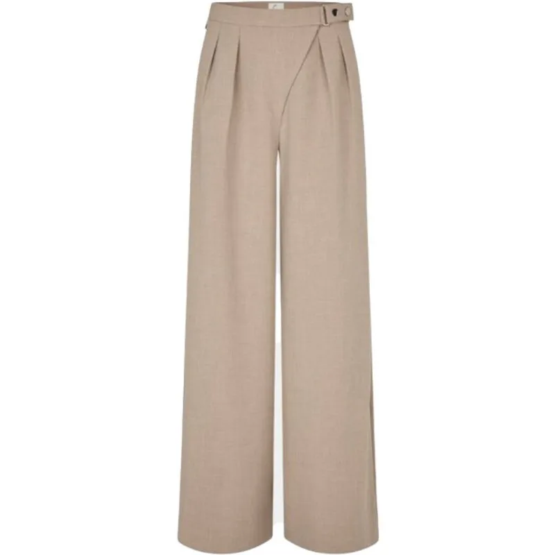 De wide-leg en high-waisted UmaFV-broek heeft een subtiel uitlopende pasvorm voor een elegante maar toch ontspannen uitstraling. De broek is ontworpen met een asymmetrische sluiting aan de voorkant, vastgezet met een gesp, drukknopen en een ritssluiting voor een verzorgde afwerking. Voorzien van functionele steekzakken in de zijnaad en achterzakken met klep. Plooien aan de voorkant geven extra structuur en definiëren het silhouet. Ontworpen in Kopenhagen. Extra wijde pasvorm Hoge taille Kleur: Latte melange Materiaal: 65% Recycled Polyester, 28% Viscose, 7% Elastane
