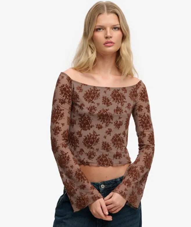Slim fit - ontworpen om nauwer om het lichaam te vallen voor een meer getailleerde look Bardot halslijn Mesh uitlopende mouwen Cropped model Gegolfde zoom Kenmerkend metalen label op de achterkant De Flocked Mesh Top Met Lange Mouwen brengt een vleugje romantiek in elke zomergarderobe. Het dromerige bloemendesign, de Bardot halslijn en de delicate gegolfde zoom creëren een zachte, vrouwelijke charme die perfect aanvoelt voor zonovergoten zomerdagen of als opvallend item tijdens je vakantie. Geco