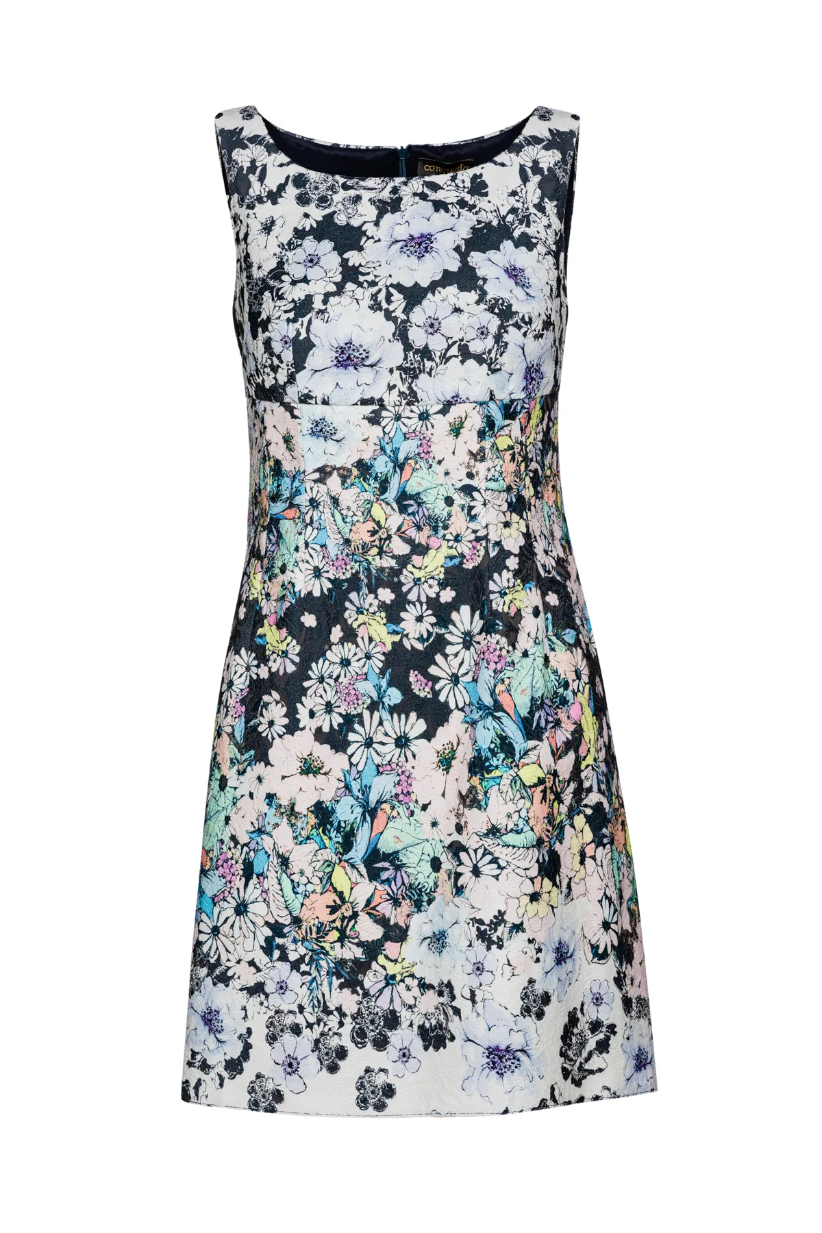 Zomerjurk in gebloemd stretchbrokaat. Zonder mouwen en met boothals. Figuurnaden bij de buste. Naad onder de buste. Verticale figuurnaden onder de naad aan de voor- en achterkant. Verborgen ritssluiting aan de achterkant. Volledig gevoerd. Empire-lijn.