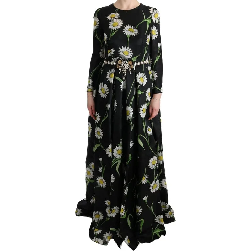 Stap naar buiten, val op, steel de show. Deze Dolce & Gabbana zijden maxi-jurk zorgt ervoor dat jij het onvergetelijke gezicht van de avond bent. Ervaar de luxe van pure zijde in een tijdloze A-lijn silhouet, ontworpen om elke figuur te flatteren. De alomtegenwoordige margrietenprint brengt een frisse, levendige energie naar klassieke elegantie. Geniet van de veilige, comfortabele pasvorm, terwijl de verfraaide riem je taille accentueert en een vleugje glamour toevoegt. De duurzame, onderhoudsarme zijde zorgt voor blijvende schoonheid. Perfect om een statement te maken op avondevents, deze jurk belichaamt Italiaanse vakmanschap en moeiteloze stijl.