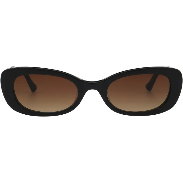 Florence by Mills ondiepe ovale zonnebril met een lichte cat-eye lift wordt aangevuld met gekartelde, gebrandmerkte pootjes. Hier getoond in klassiek zwart met flatterende bruine gradient lenzen.
