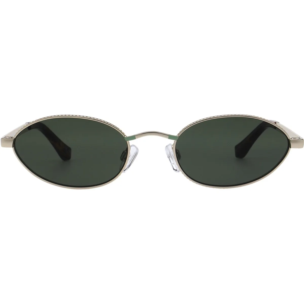 Deze ondiepe ovale metalen bril wordt u aangeboden door Florence by Mills. Hier weergegeven in een matte gouden afwerking met tortoise-horentips, wordt het aangevuld met kleine zachte groene details op de pootjes die worden herhaald op de neusbrug. Voorzien van verstelbare neuspads.