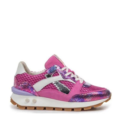 Deze sportieve runner van Floris van Bommel valt direct op door het kenmerkende silhouet en de profielzool. De Floris van Bommel Blokki 07.06 heeft een loopvlak met stevige blokjes die vanaf de zijkant goed zichtbaar zijn en de schoen een dynamische uitstraling geven. De combinatie van een rozekleurige mix van verschillende materialen en een metallic label op de zachte tong zorgt voor een modern uiterlijk. Aan de binnenkant van de tong staat een korte tekst die de sneaker een herkenbare uitstraling geeft.Comfort en details in één sneaker Sportieve dames sneaker met vetersluiting en platte zool Loopvlak met blokjes en twee ronde plugs aan de zijkant van de zool Robuuste stabilizer bij de hiel voor een stabiel gevoel tijdens het lopen Roze, meerkleurige buitenkant van leer met verschillende structuren Volledig leren voering voor een soepele, aansluitende pasvorm Uitneembaar, met leer bekleed voetbed, geschikt voor eigen inlegzolen of steunzolen Normale leest, geschikt voor dagelijks gebruikVoor dagelijkse stappen met stijlDeze sneaker sluit goed aan bij een casual outfit voor werk, een bezoek aan de stad of een dag op pad. De platte zool met blokstructuur biedt ondersteuning bij elke stap, terwijl de mix van materialen en kleuren de schoen een eigentijdse uitstraling geeft.De signatuur van Floris van BommelFloris van Bommel combineert ambachtelijke schoenmakerij met eigentijdse ontwerpen. De aandacht voor materialen, pasvorm en specifieke details zorgt voor schoenen die netjes ogen en geschikt zijn voor dagelijks gebruik.Een comfortabele runner met eigen signatuur, passend bij wie stijl en gemak wil combineren in het dagelijks leven.